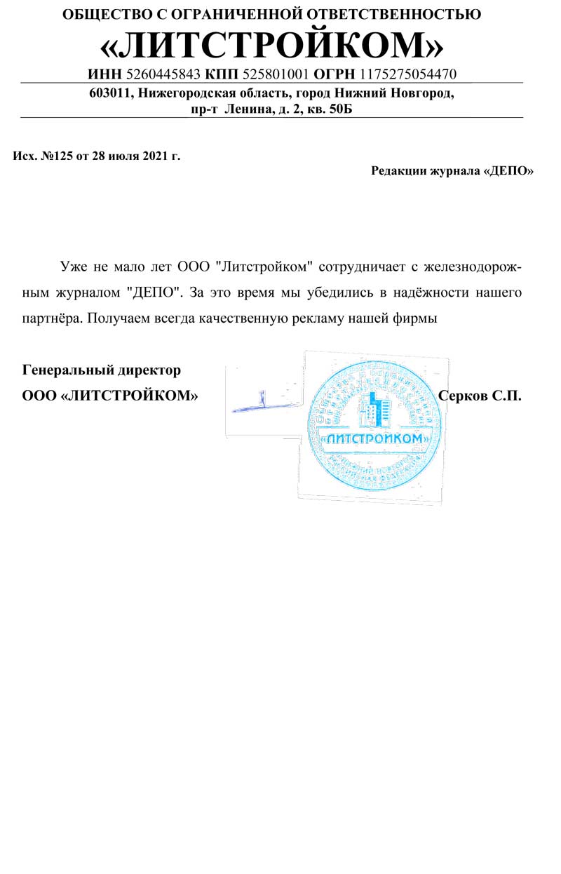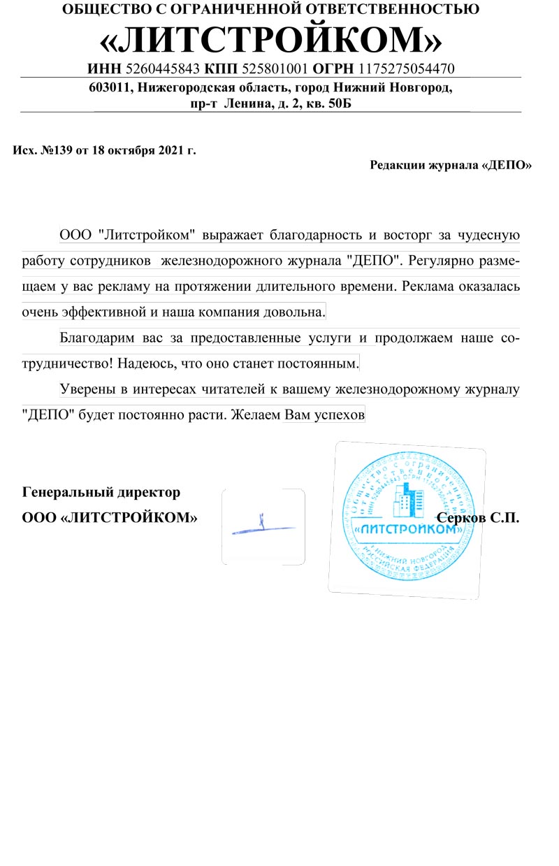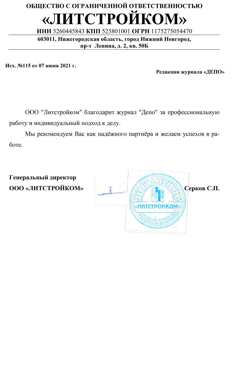 ООО "Литстройком" благодарит журнал "ДЕПО" за профессиональную работу и индивидуальный подход к делу.