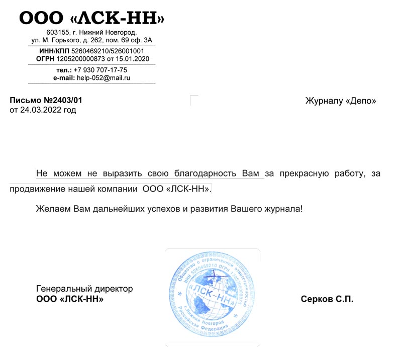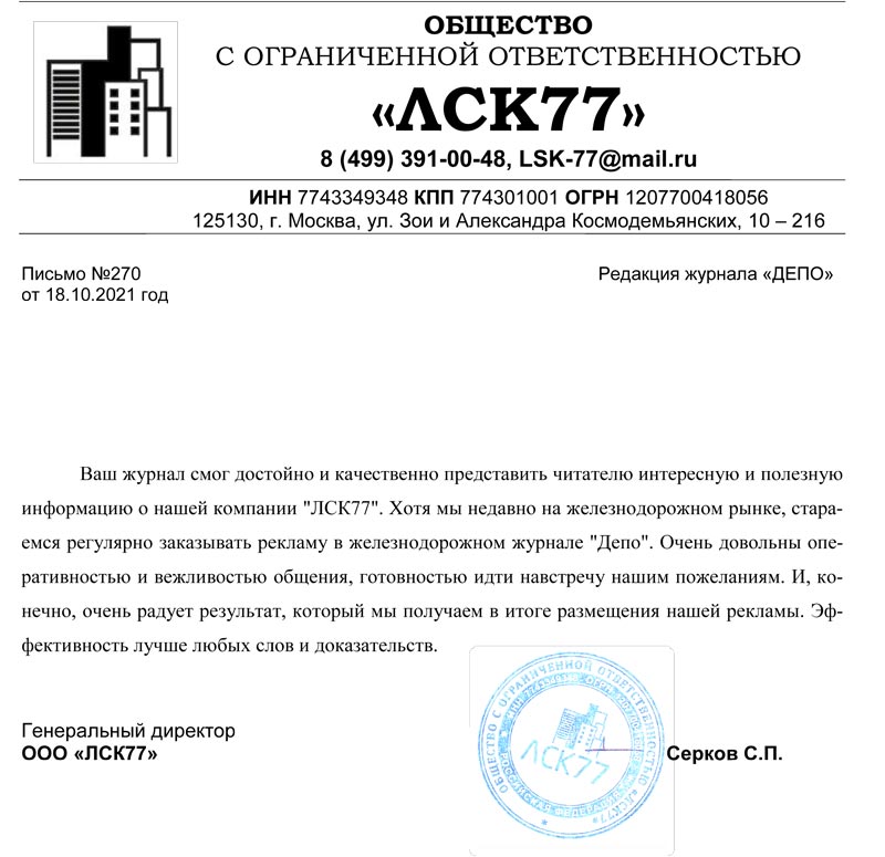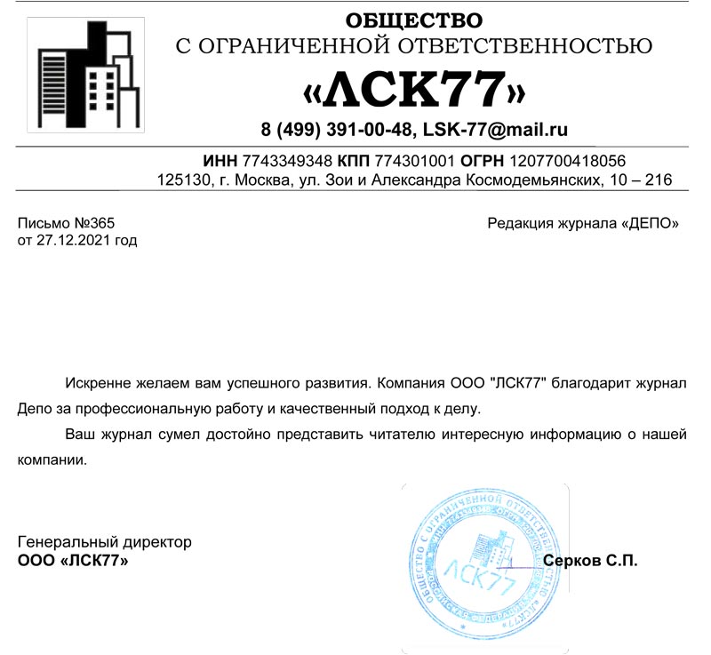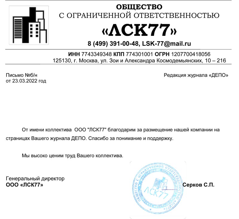 От имени коллектива ООО "ЛСК77" благодарим за размещение нашей компании на страницах вашего журнала "ДЕПО".