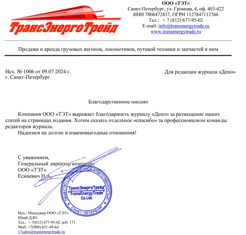 Компания ООО «ТЭТ» выражает благодарность журналу «Депо» за размещение наших статей на страницах издания.