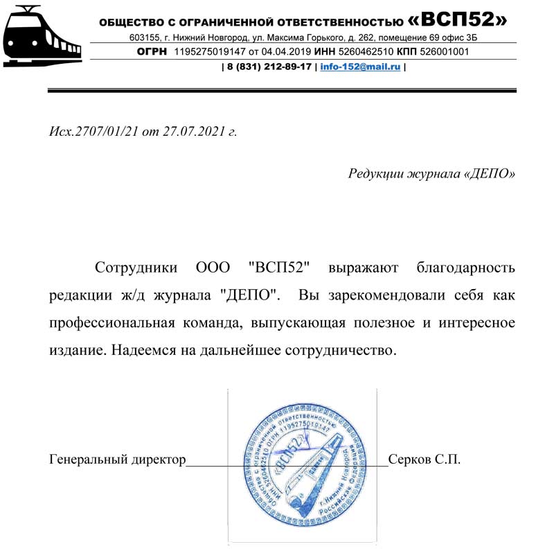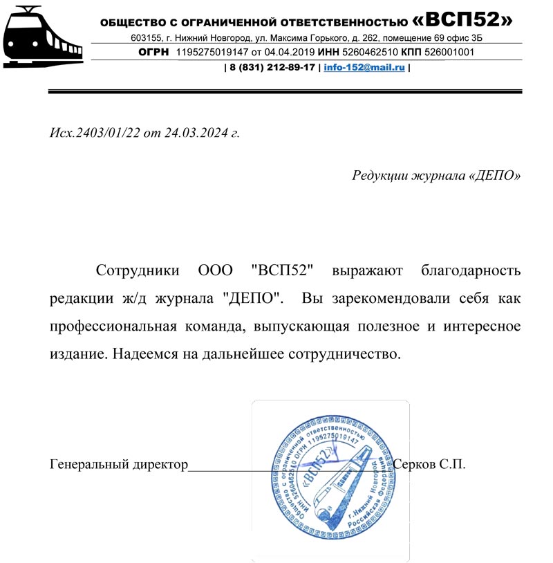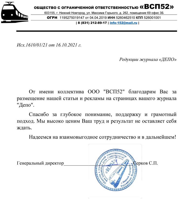 От имени коллектива ООО "ВСП52" благодарим вас за размещение нашей статьи и рекламы на страницах вашего журнала "ДЕПО".