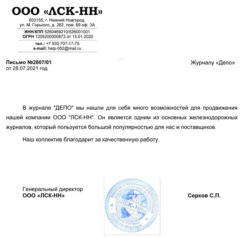 ООО "Литстройком" выражает благодарность и восторг за чудесную работу сотрудников железнодорожного журнала "ДЕПО". Регулярно размещаем у вас рекламу на протяжении длительного времени.