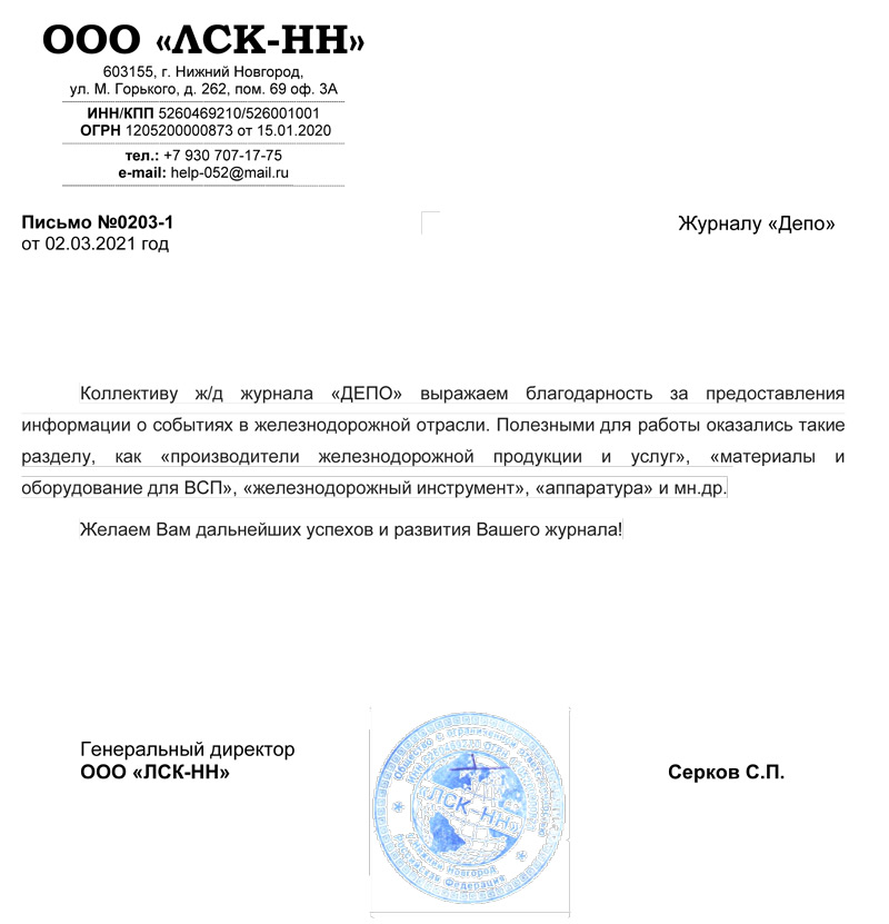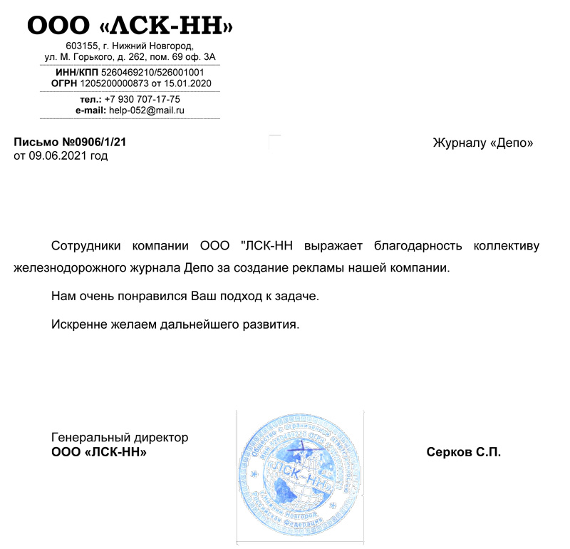 Сотрудники компании ООО "ЛСК-НН" выражают благодарность коллективу железнодорожного журнала "ДЕПО" за создание рекламы нашей компании.