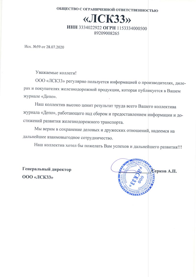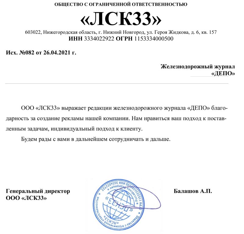 ООО "ЛСК33" выражает редакции железнодорожного журнала "ДЕПО" благодарность за создание рекламы нашей компании.