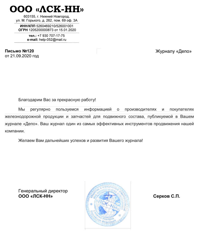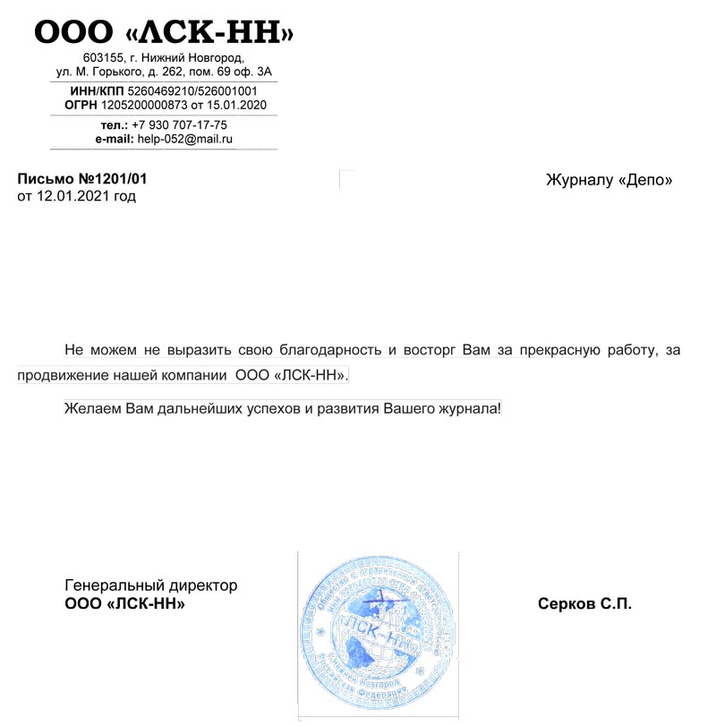 Сотрудники компании ООО "ЛСК-НН" выражают благодарность коллективу журнала "ДЕПО" за его профессионализм и индивидуальный подход к каждому клиенту. Желаем дальнейшего развития и процветания!