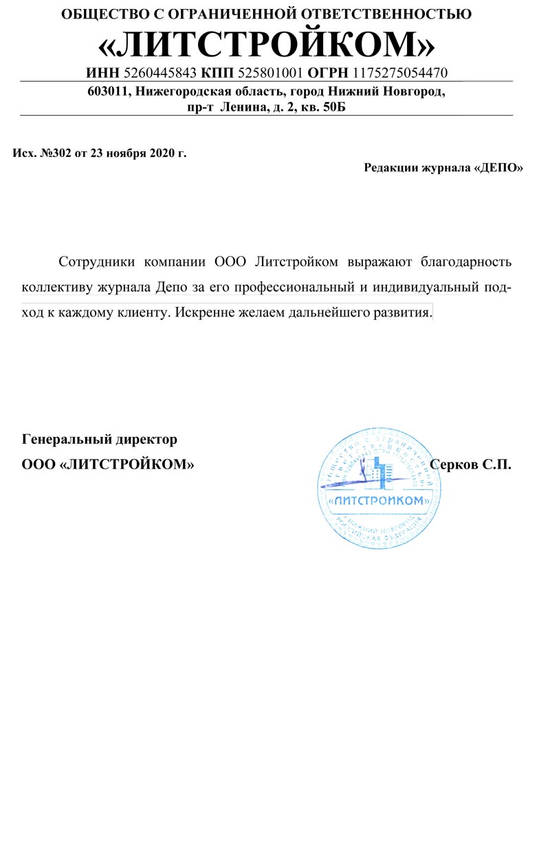 Сотрудники компании ООО Литстройком выражают благодарность коллективу журнала ДЕПО за его профессиональный и индивидуальный подход к каждому клиенту.