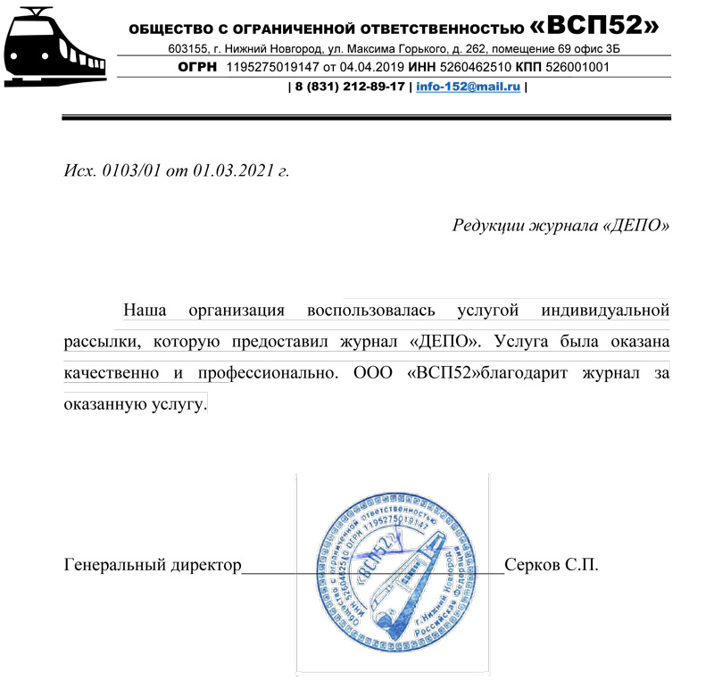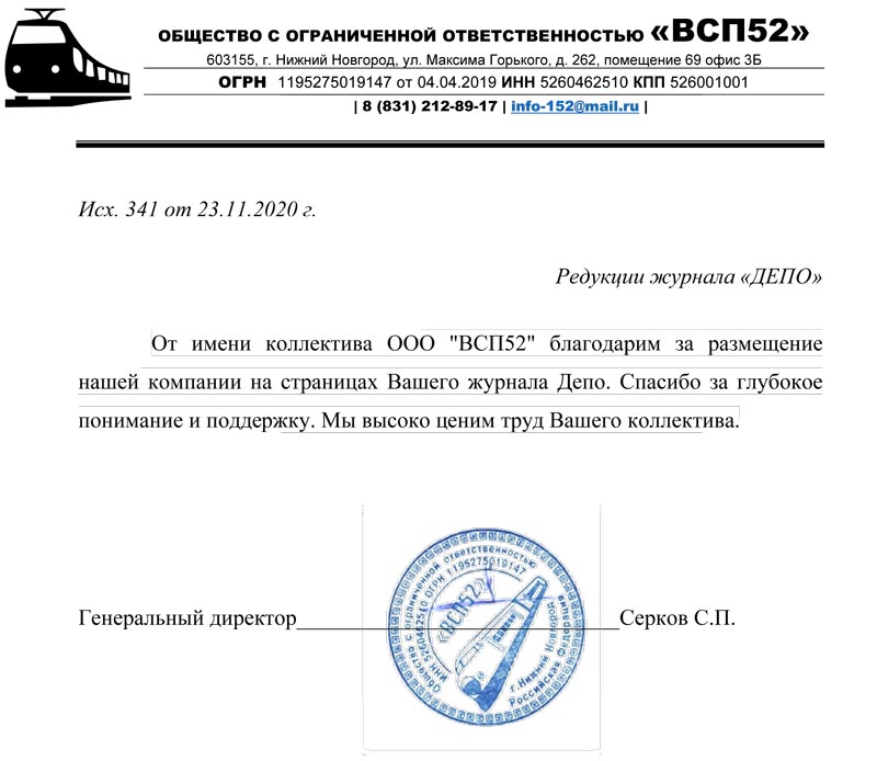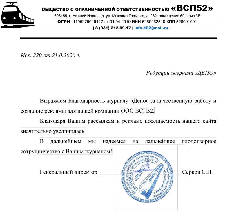 Выражаем благодарность журналу "Депо" за качественную работу и создание рекламы для нашей компании ООО ВСП52.
