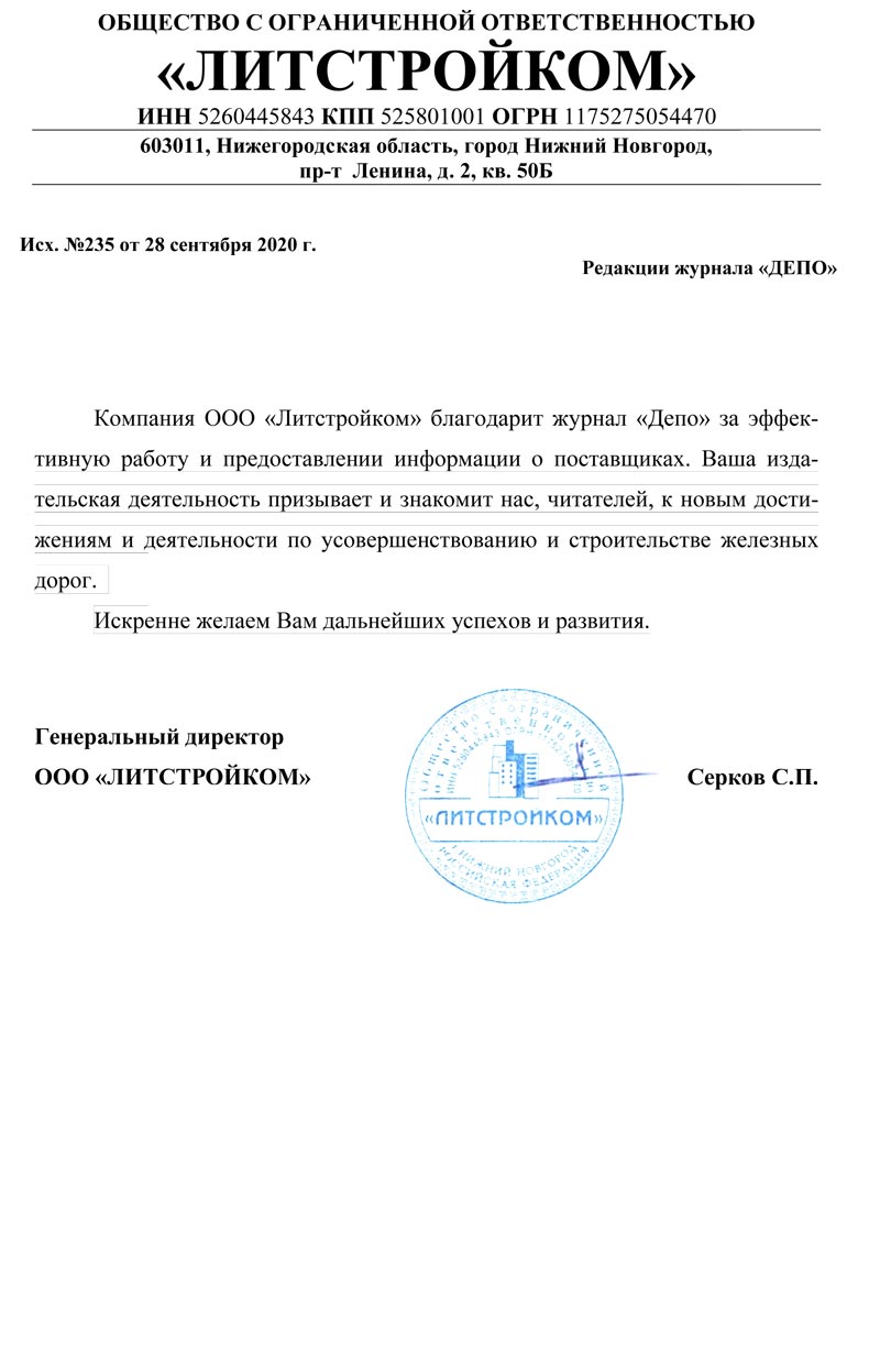 Компания ООО "Литстройком" благодарит журнал "Депо" за эффективную работу и предоставление информации о поставщиках.