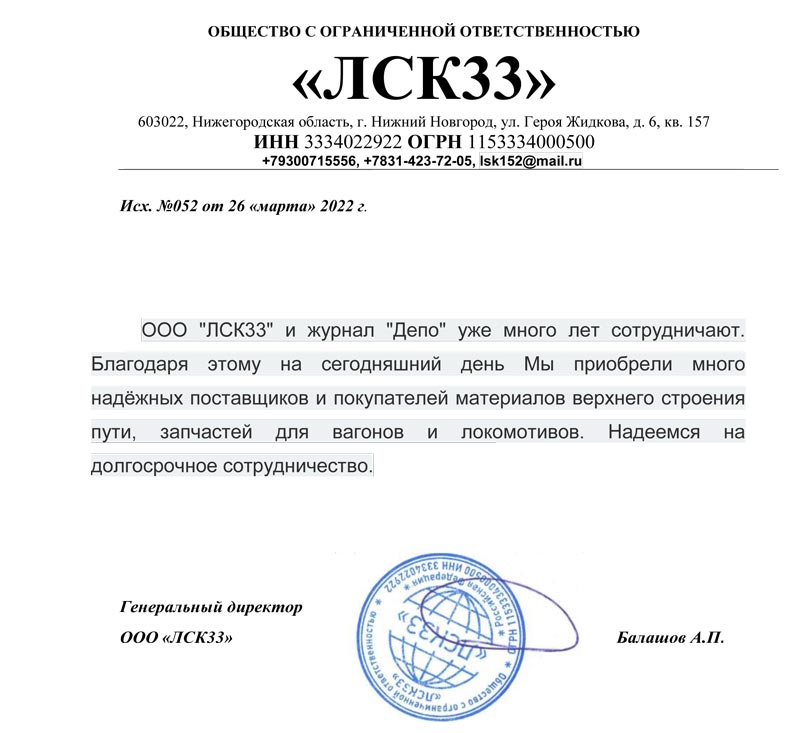 От имени коллектива ООО "ЛСК77" благодарим за размещение нашей компании на страницах вашего журнала "ДЕПО".