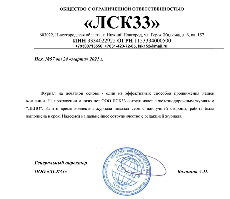 ООО "ЛСК33" выражает редакции железнодорожного журнала "ДЕПО" благодарность за создание рекламы нашей компании.