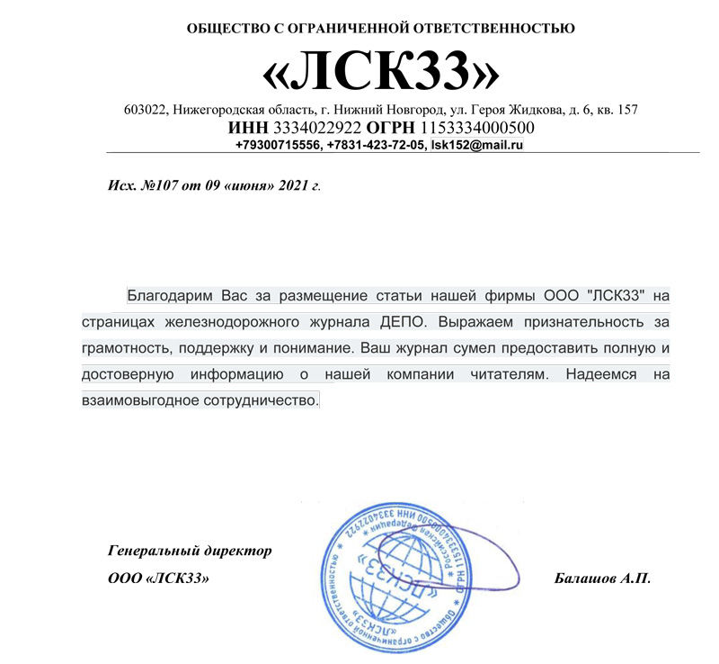 Благодарим вас за размещение статьи нашей фирмы ООО "ЛСК33" на страницах железнодорожного журнала "ДЕПО".