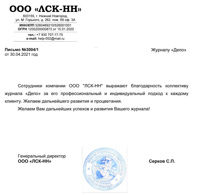 Сотрудники компании ООО "ЛСК-НН" выражают благодарность коллективу журнала "ДЕПО" за его профессионализм и индивидуальный подход к каждому клиенту. Желаем дальнейшего развития и процветания!