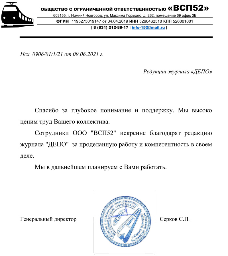 От имени коллектива ООО "ВСП52" благодарим за размещение нашей компании на страницах вашего журнала ДЕПО.