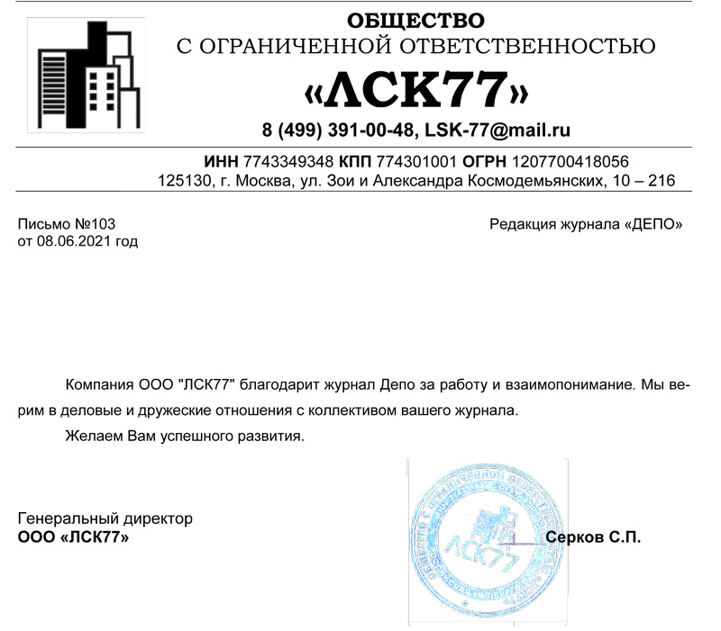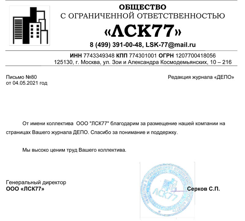От имени коллектива ООО "ЛСК77" благодарим за размещение нашей компании на страницах вашего журнала ДЕПО. Спасибо за понимание и поддержку. Мы высоко ценим труд вашего коллектива.