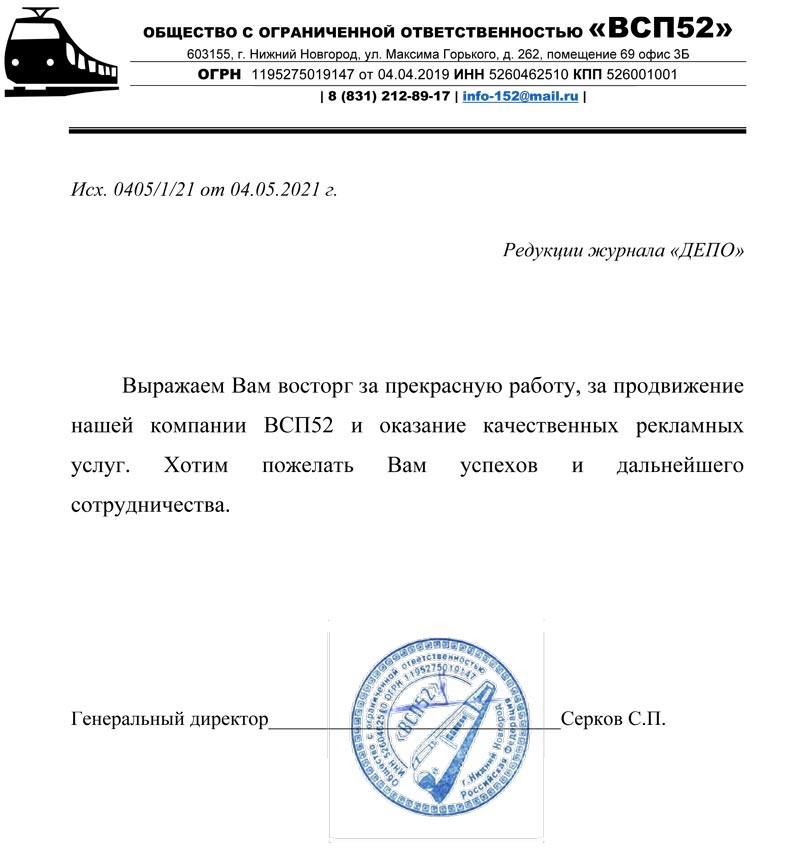 Выражаем благодарность журналу "Депо" за качественную работу и создание рекламы для нашей компании ООО ВСП52.